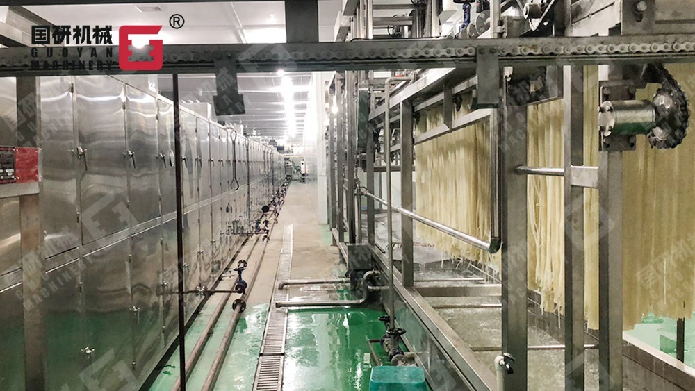 大米→提升→大米配送→泡米→射流输送→清洗→除砂→米水分离→大米输送→粉碎→旋风分离→出料→储料→提升→定量→加水搅拌→储料输送→提升→储料喂料→自熟→挤丝→输送→切断挂杆→连续吊挂老化→转杆→淋水→松丝→干燥→落杆→切断→输送→包装→成品