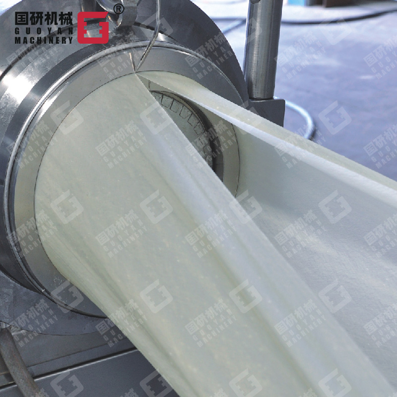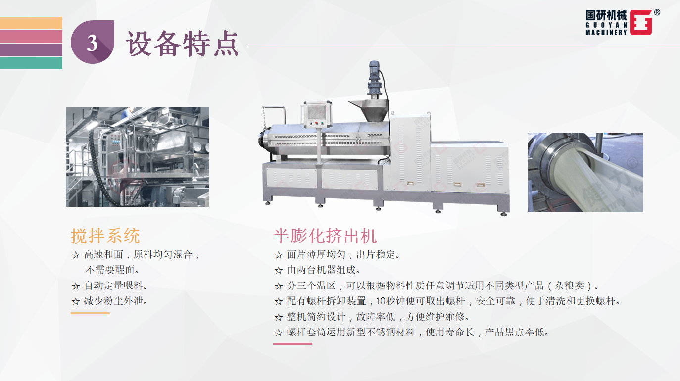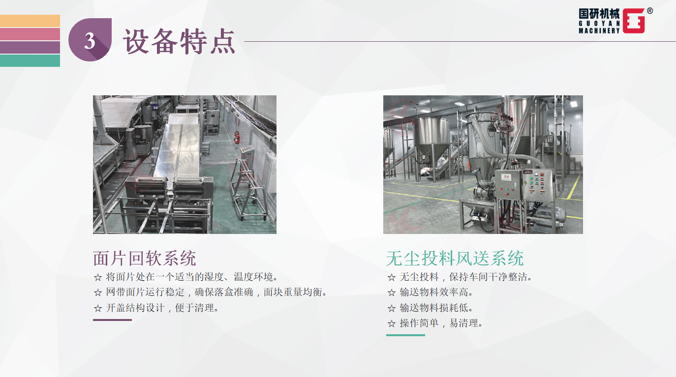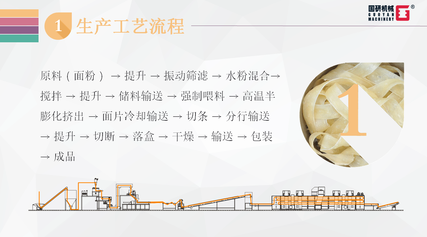 非油炸方便面生产线,是集自动和面、自动加料、挤压膨化、面片冷却输送、自动切条、分行输送自动提升、加湿回软切断、自动落盒成形、自动干燥到成品输送入包装于一体的全自动生产线。该设备主要应用于挤出式非油炸快食面的生产,工艺流畅、功能齐全、自动化程度高,机器出品稳定,工艺技术强于国内同类生产设备,是油炸方便面厂家更新换代的理想选择。